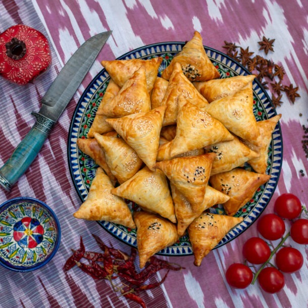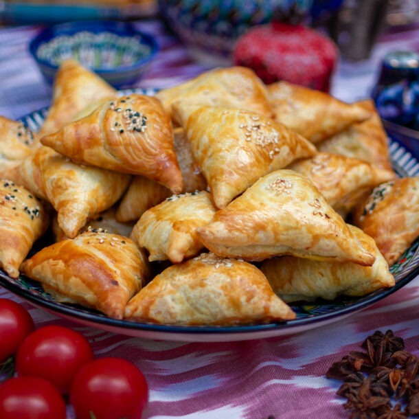 Le samsa d’Asie centrale — petit beignet triangulaire — se prépare selon les pays avec pâte à pain ou pâte à pâtisserie. Chez PLOV.FR, nous avons choisi une pâte feuilletée maison au croustillant incomparable. Les garnitures les plus fréquentes : mouton, agneau, bœuf, poulet, fromage ; des versions végétariennes existent aussi (pomme de terre, potiron).